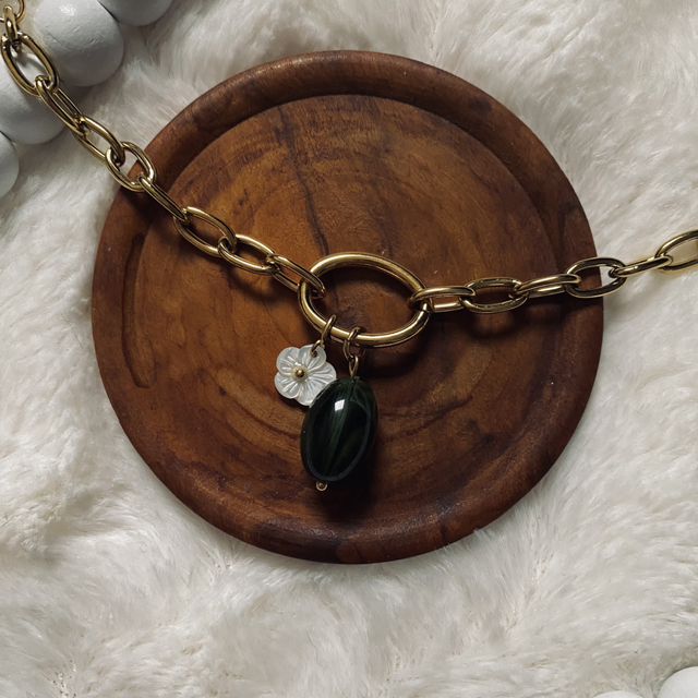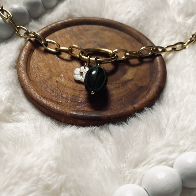 - Pendentif perle verte et fleur blanche résine